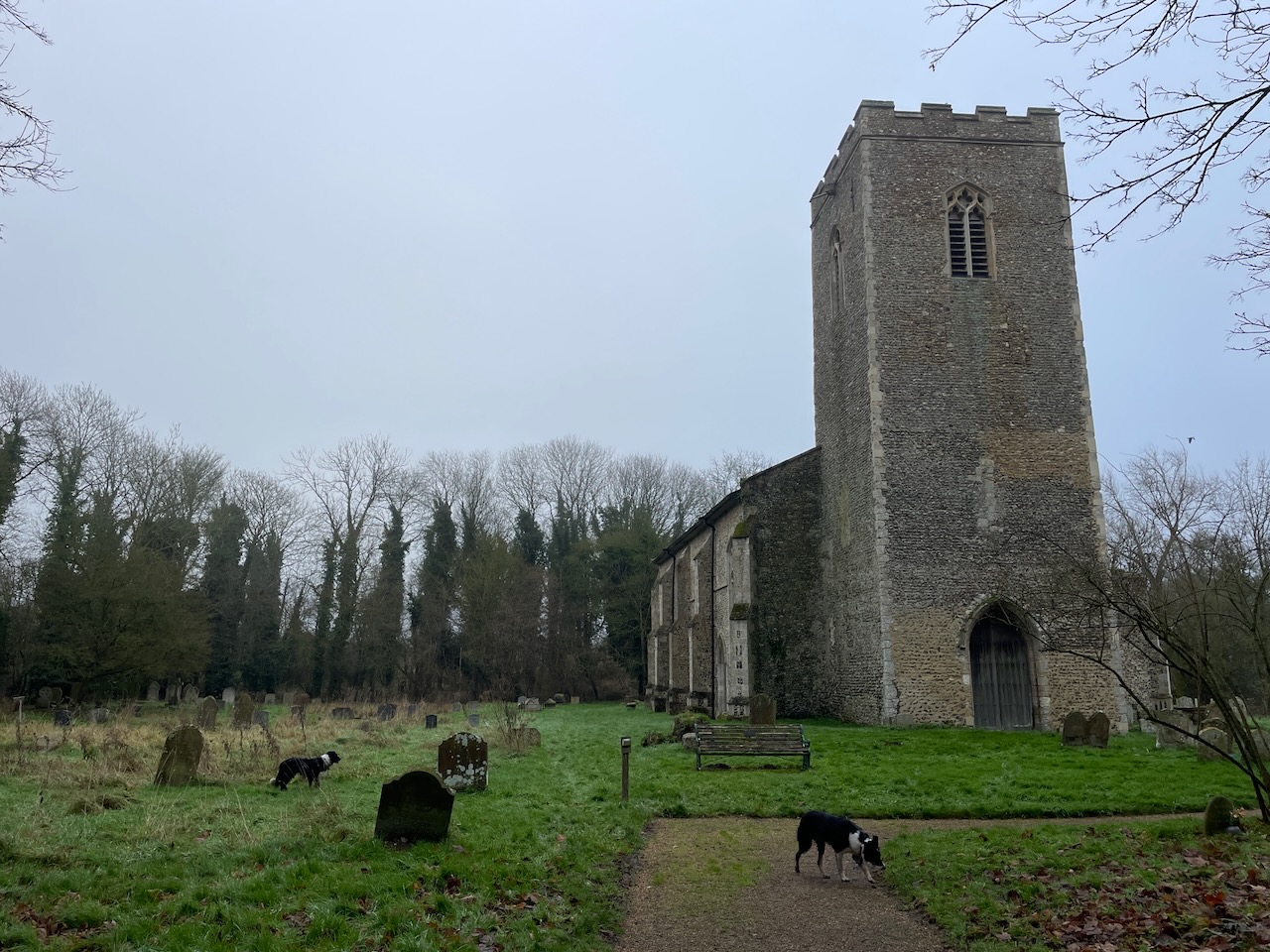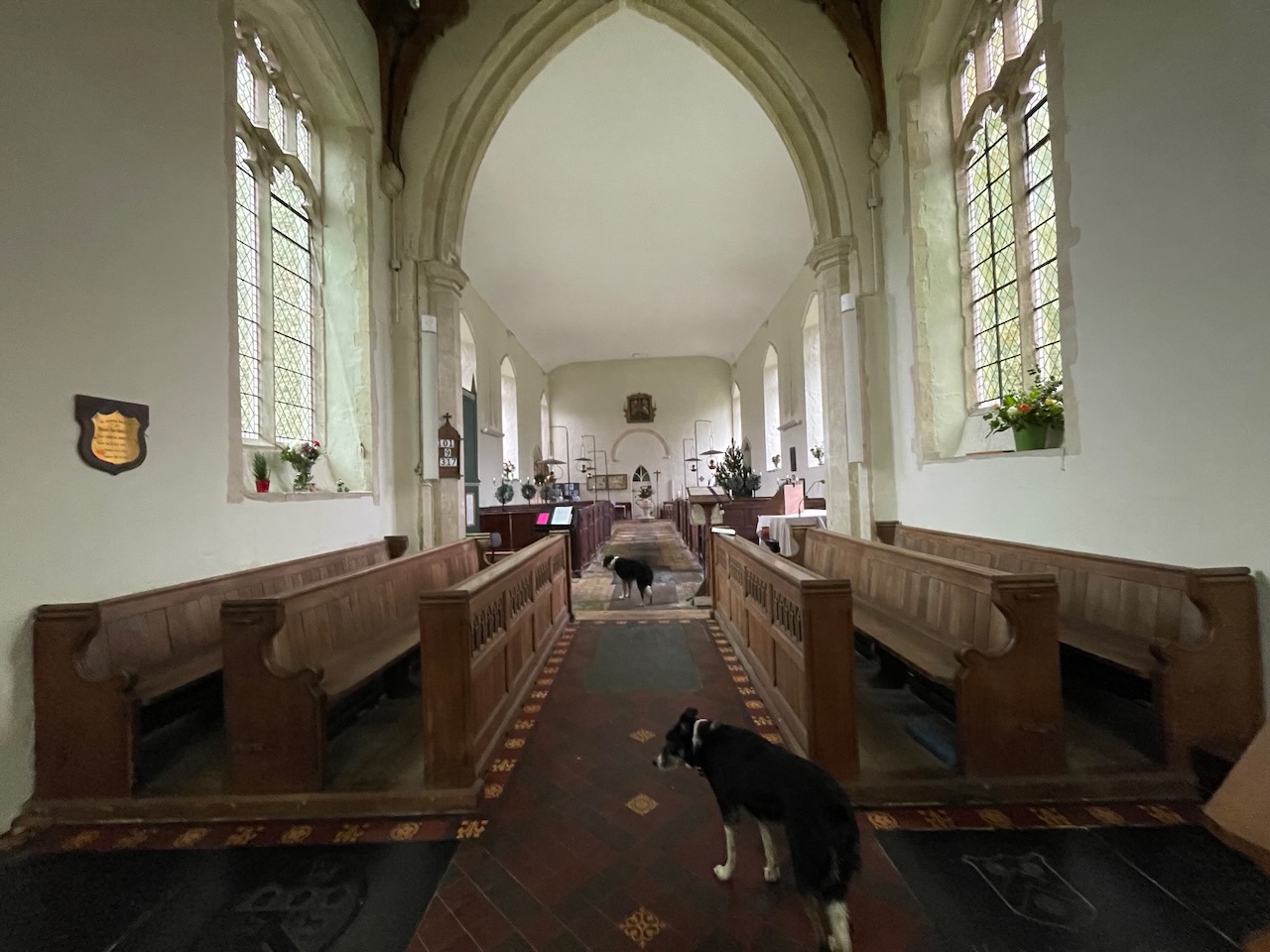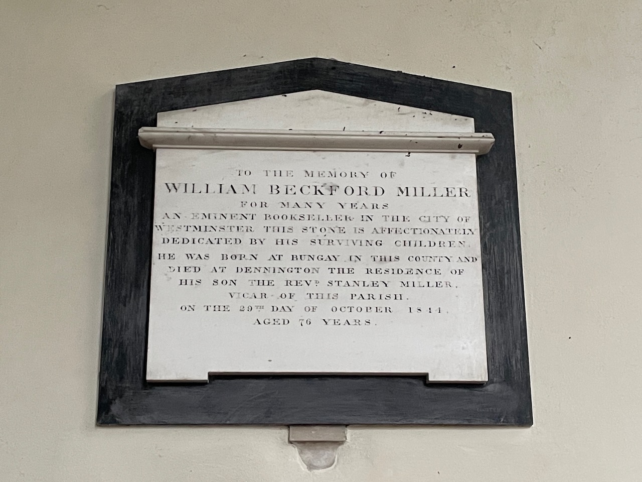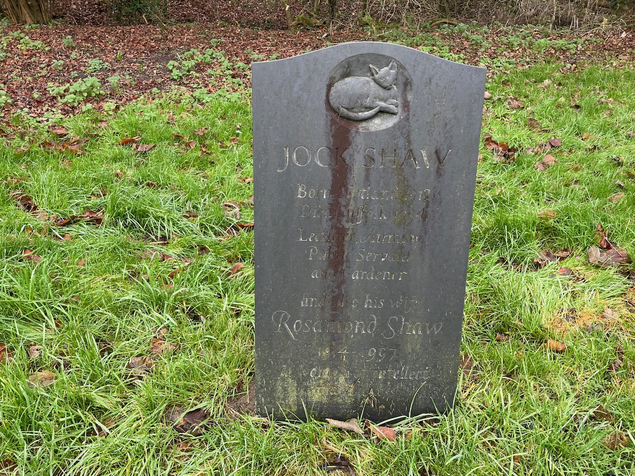 A fabulous green lane, moss growing in the centre, came out to Brundish Church, a natural thought to Rupert. Simon Knott says: You step through into an enchanting interior, at once simple and dignified and full of light. The open, even cavernous, space of the nave segues into a chancel big enough to shrug off its 19th Century restoration.” Two nice, simple gravestones: Jock Shaw: Lecturer, Public Servant, Gardener. Inside William Beckford Miller, Bookseller, born Bungay, died Dennington.