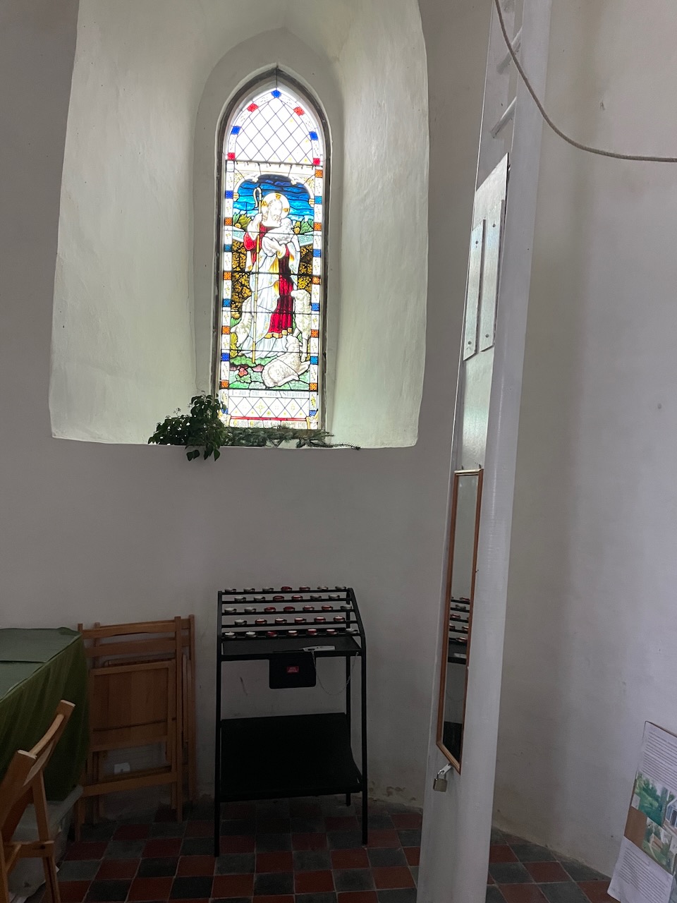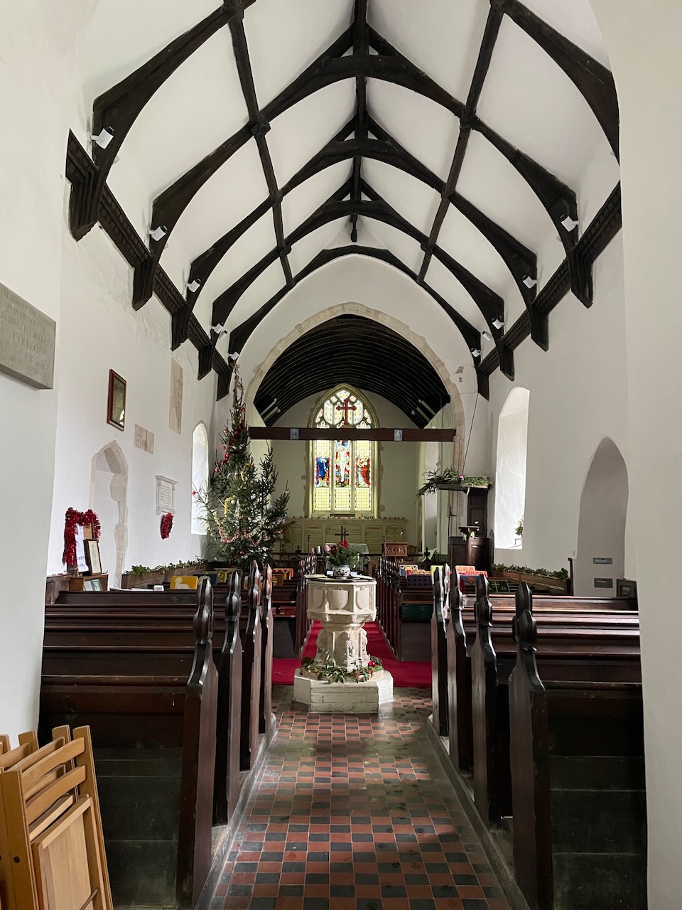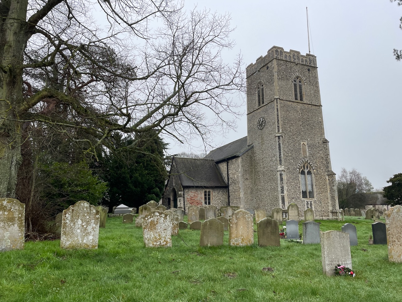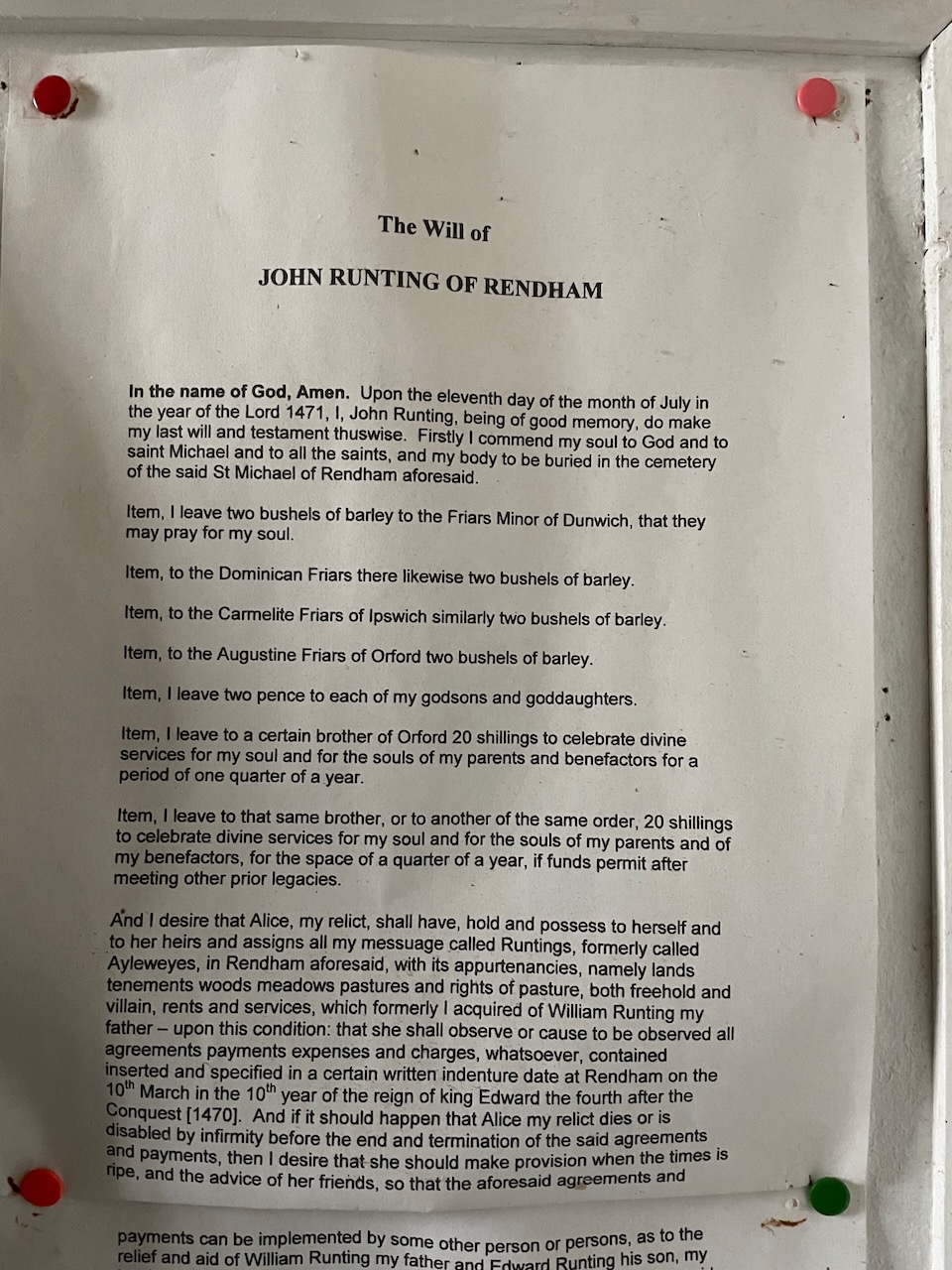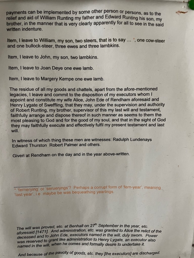 Popped into Rendham Church, which with the same white walls and roof as Brundish but none of it’s simplicity. I did not warm to it until I found the small local history museum at the back of the church, with a copy of a fascinating Will, laying out the insurance of John Runting’s afterlife in the form of bussles of barley gifted to Friars Minor at Dunwhich etc to pray for his soul. (Photo below) (Just enjoyed echos of this system in the excellent production of Wolfe Hall)
