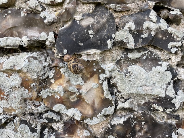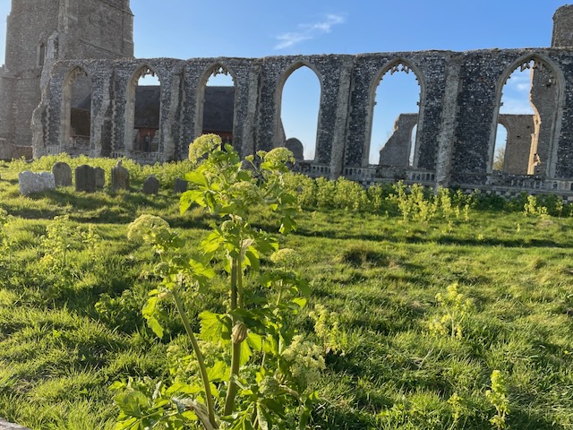 It’s good to get out. After days of head down on the land, I was glad for the opportunity to look out. Every hedgerow was edged with Alexanders. Richard looked it up: Smyrnium olusatrum, common name Alexanders is an edible flowering plant of the family Apiaceae (Umbelliferae), which grows around the Mediterranean and Atlantic coastal regions of Europe. It was formerly widely grown as a pot herb, but is now appreciated mostly by foragers.” The Alexander was part of the first evidence of cliff erosion – an Alexander at the foot of a elm clump recently fallen, allowed Richard to easily pull out the root and break it – a sweet, swede scent.