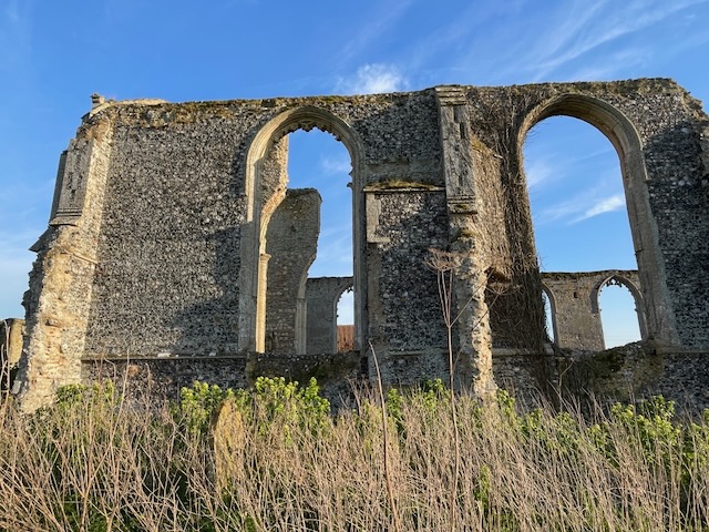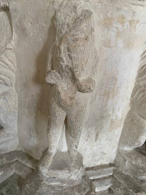 At Cove Hithe church, glorious in the evening sun, the grey of flint edged offset against the lime green Alexanders. How the lichen grows on the north side, I noticed this time, as Richard marveled at the knapping of the square of flints. Inside a definite woodwose on the font.