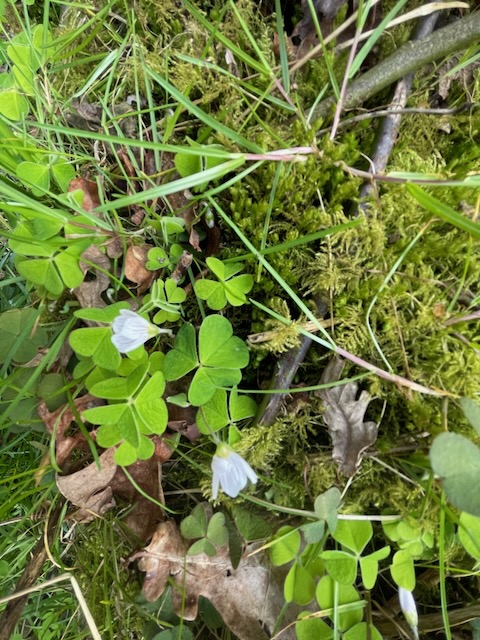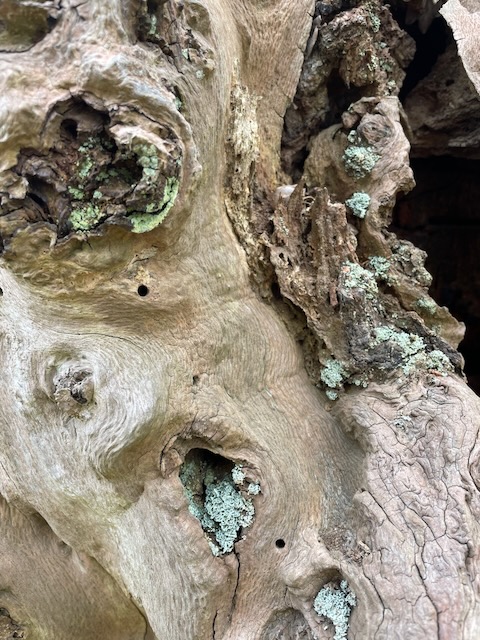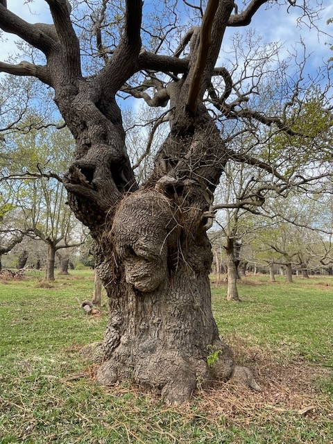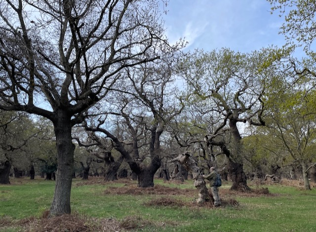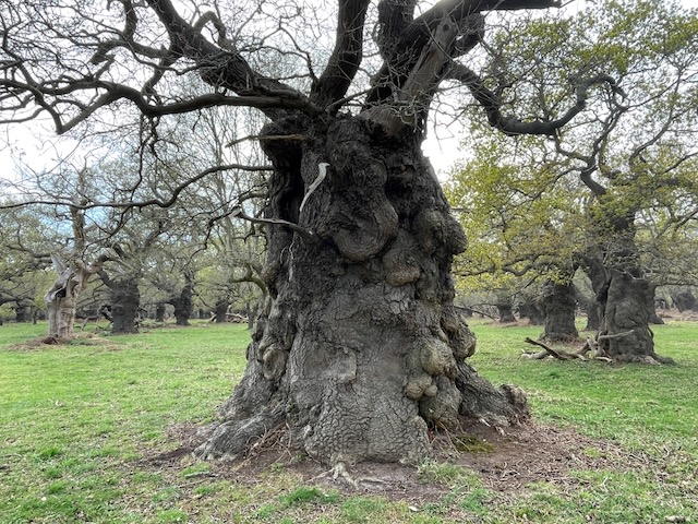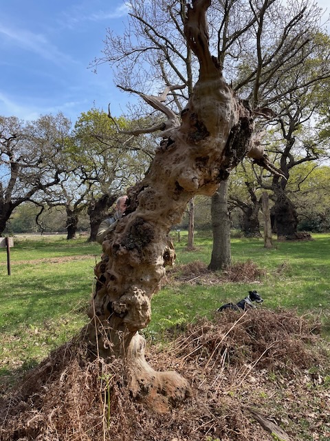 Staverton Thicks was the place I wanted to take Richard to. Wood Pasture. Planted in the C15th. Those great pollarded oaks were just coming into blossom, many we noticed at variable times and I realised that I had never visited this time of year before. The wood sorrel and creeping jenny on the ground. My old friends were there, one I called Albert, particularly popular with epicormic growths: As Richard reminded me, it is caused by proliferation of growth from buds under the bark. Commonly these take the form of roughly hemi-spherical swellings. The grain is much wilder, swirling in different directions, with the numerous buds showing up as circles, giving rise to the expressions ‘pippy oak’ or ‘cat’s paw’. This attractively-figured grain makes pippy oak valuable for veneers and in wood-carving and there are stories of promising-looking burrs being ‘poached’.