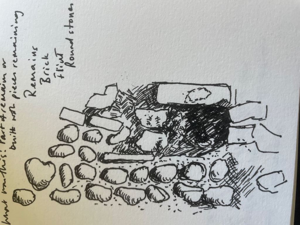 This is a mystery I found to explore as I drew a small area of construction, looking at the material used, flint, round stone, brick, stone made rectangles (don’t know the name) feeling the labour involved, piecemeal, fragments from both space and time, patched up.