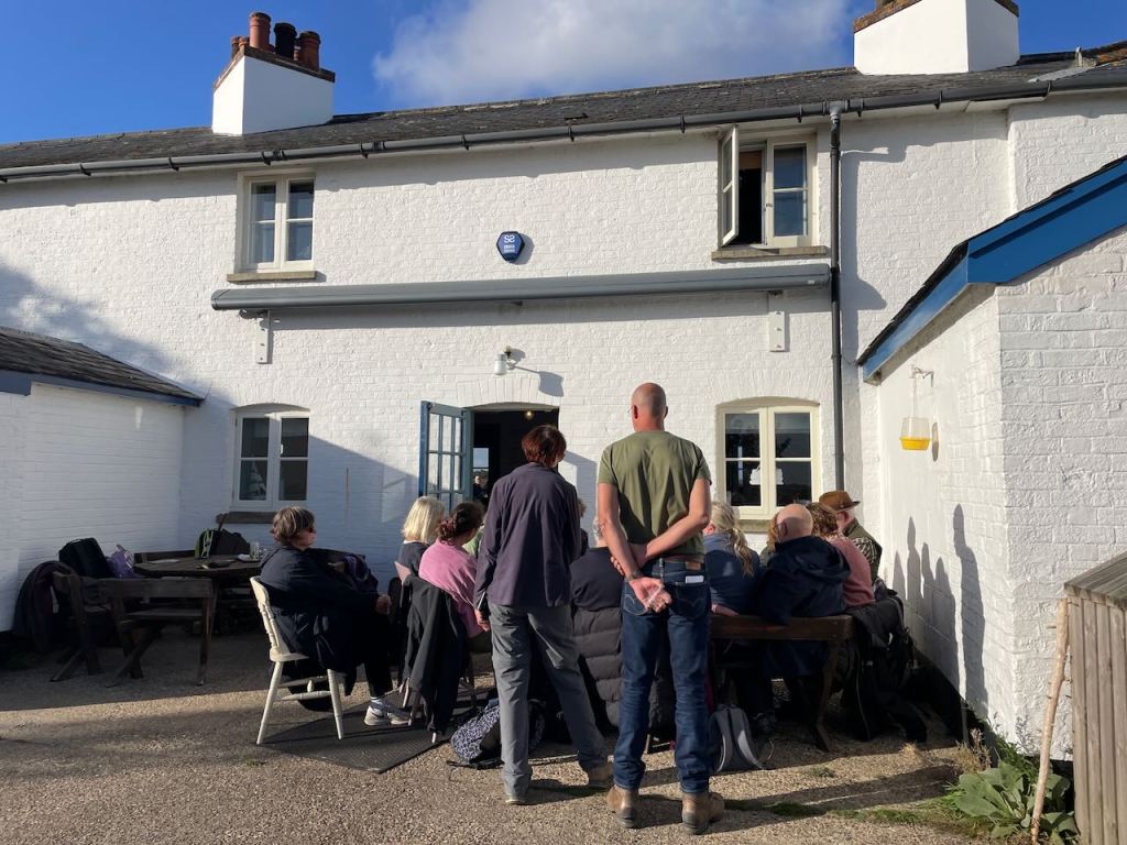 Arabella Marshall, an artist, tells us a bit about how her window arrived at Minsmere chapel in the marshes. 5 years before she visited, had a vision and conceived the idea of a window, stained glass, in the ruined place where there clearly once was a window. She liked the idea of people finding this unexpectedly. (Rather than the small pilgrimage we did). She told us some brief history. The chapel was noted in the Doomsday book, with 10 habitations around, some working as peat diggers and at the harbour near by. But the living was tough, the place abandoned, the chapel taken down to be rebuilt more in land at Leiston. Was what remains here once part of the original chapel or built up from the remains? The remains of the day. Remainder. Left over.