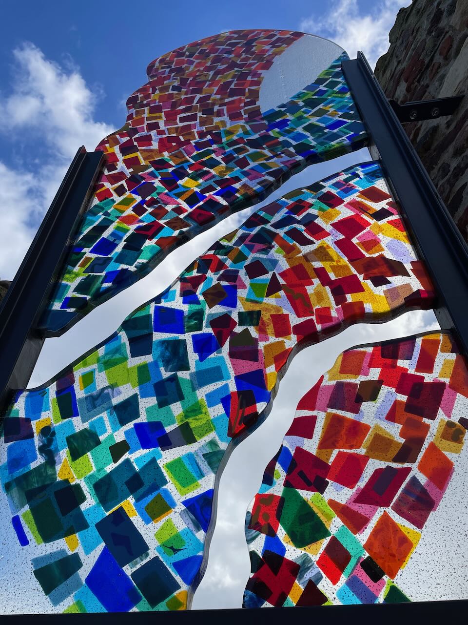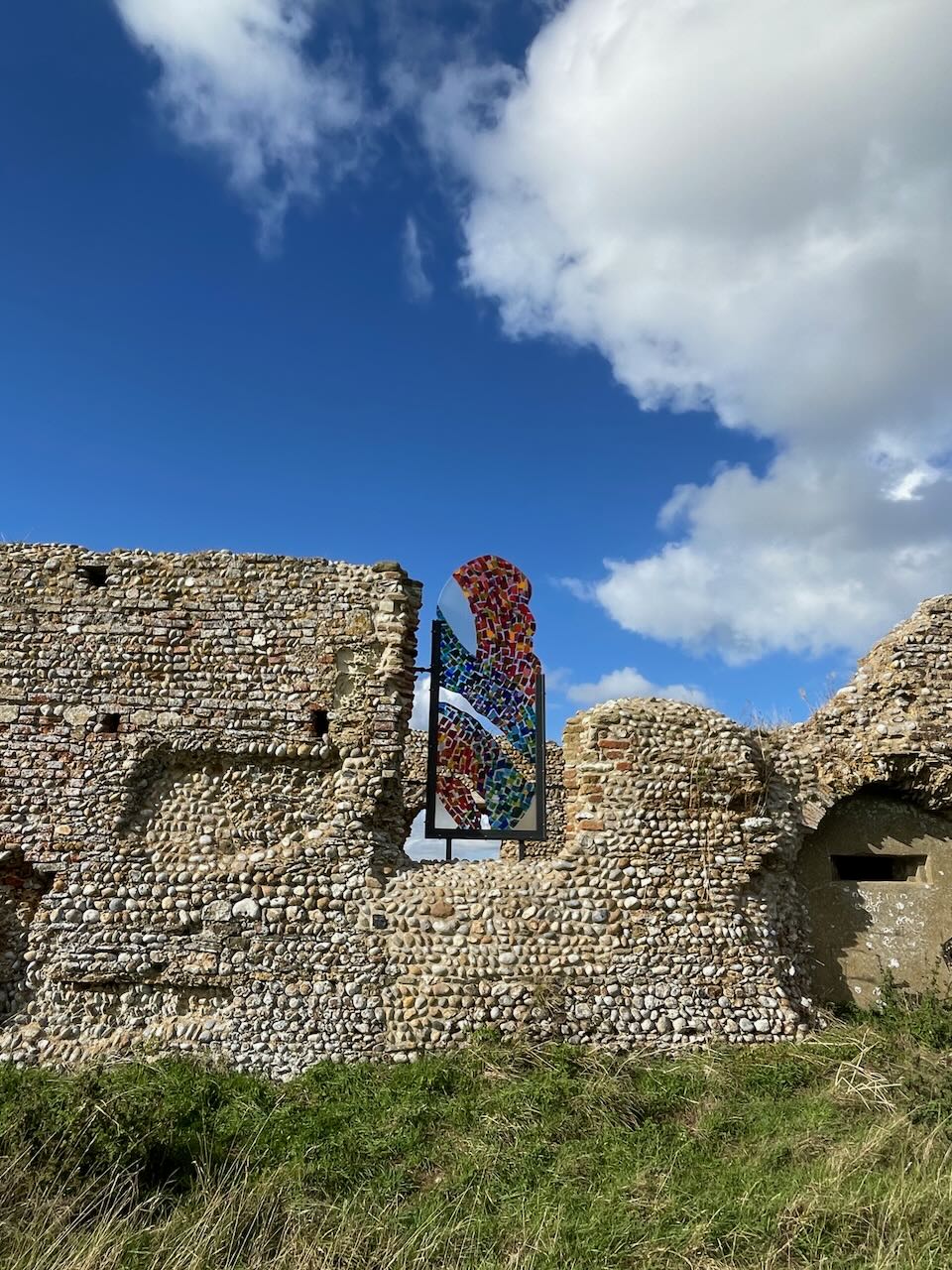 Arabella Marshall, an artist, tells us a bit about how her window arrived at Minsmere chapel in the marshes. 5 years before she visited, had a vision and conceived the idea of a window, stained glass, in the ruined place where there clearly once was a window. She liked the idea of people finding this unexpectedly. (Rather than the small pilgrimage we did). She told us some brief history. The chapel was noted in the Doomsday book, with 10 habitations around, some working as peat diggers and at the harbour near by. But the living was tough, the place abandoned, the chapel taken down to be rebuilt more in land at Leiston. Was what remains here once part of the original chapel or built up from the remains? The remains of the day. Remainder. Left over.