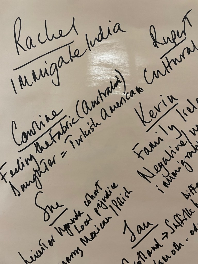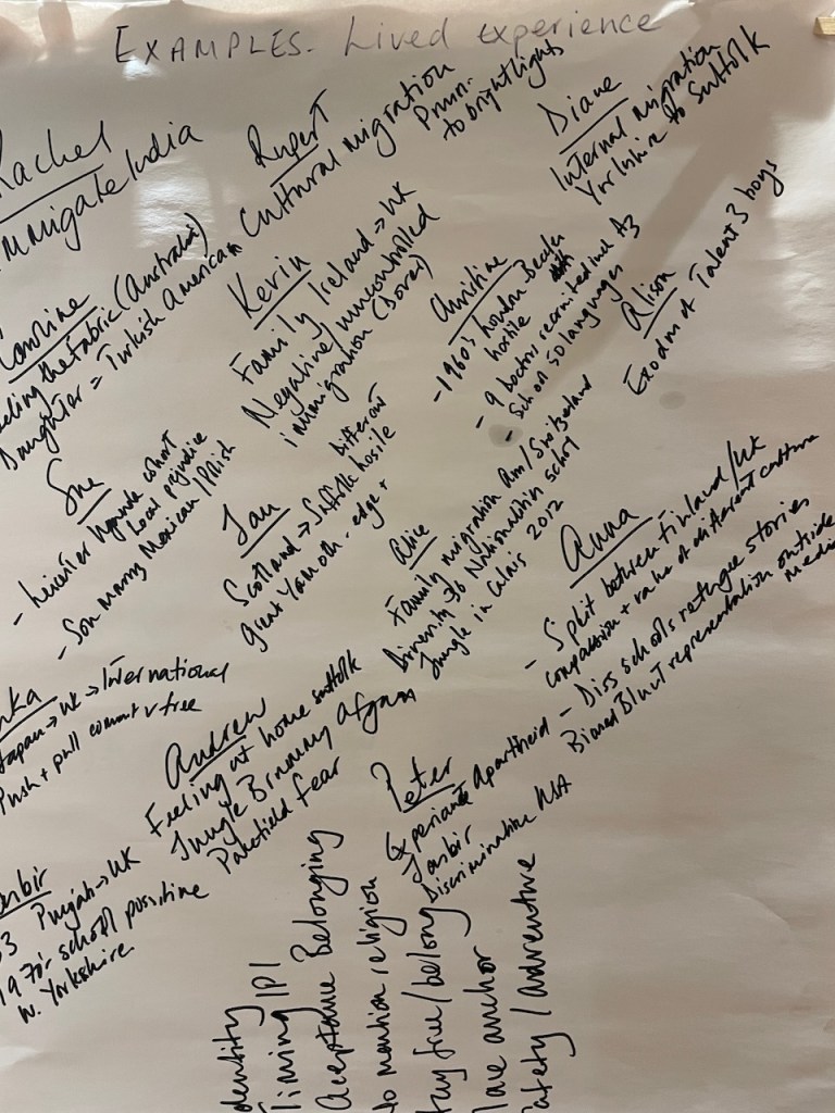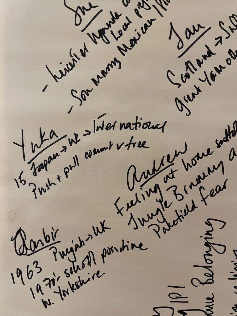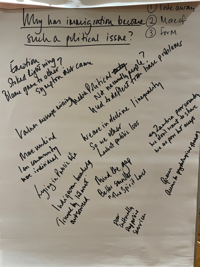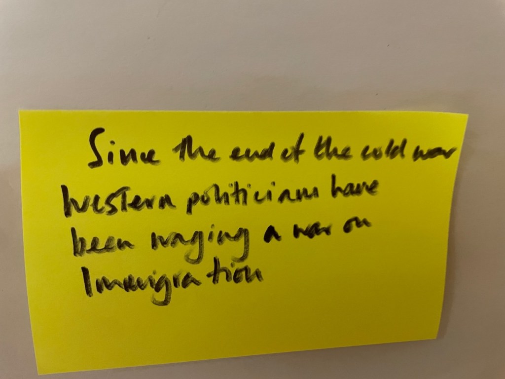 The 3 hours we had used an element of the Socratic Dialogue form, by inviting us to share our own direct experience of migration / immigration. This took a good hour with 16 fascinating and rich stories, in which sometimes surprisingly we found we all had some direct often family related experience of migration which we could relate to.