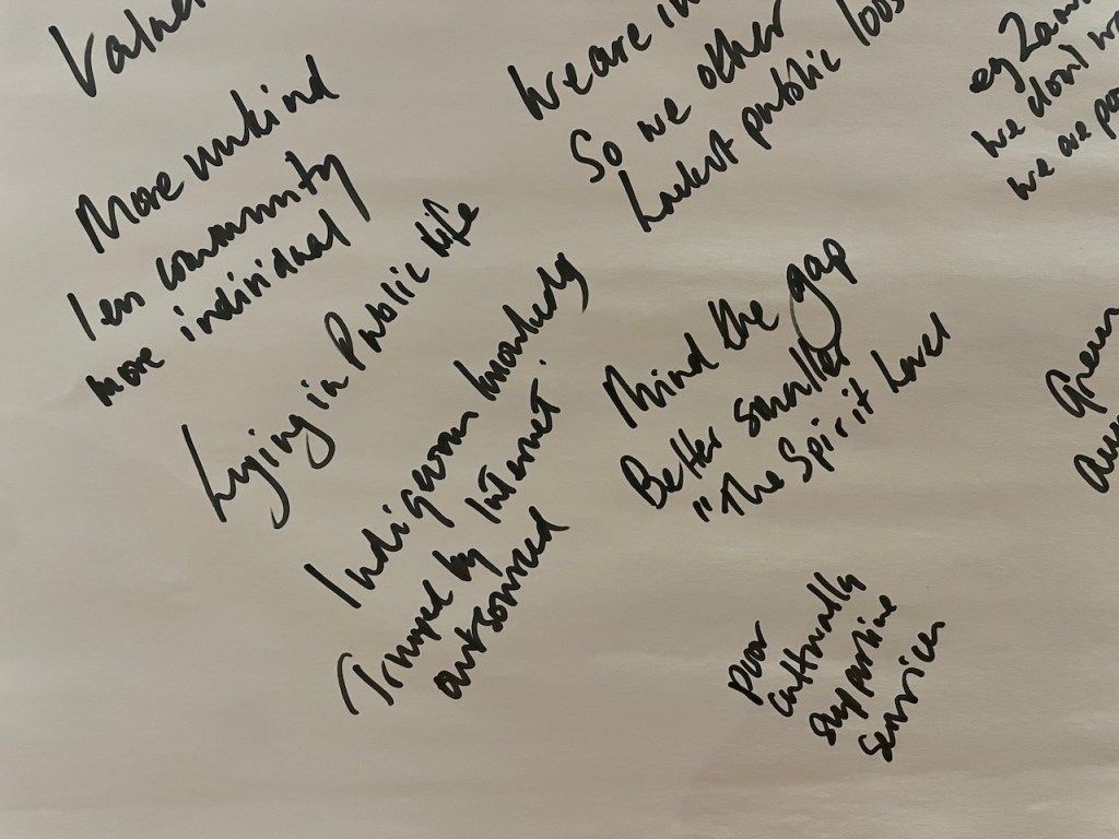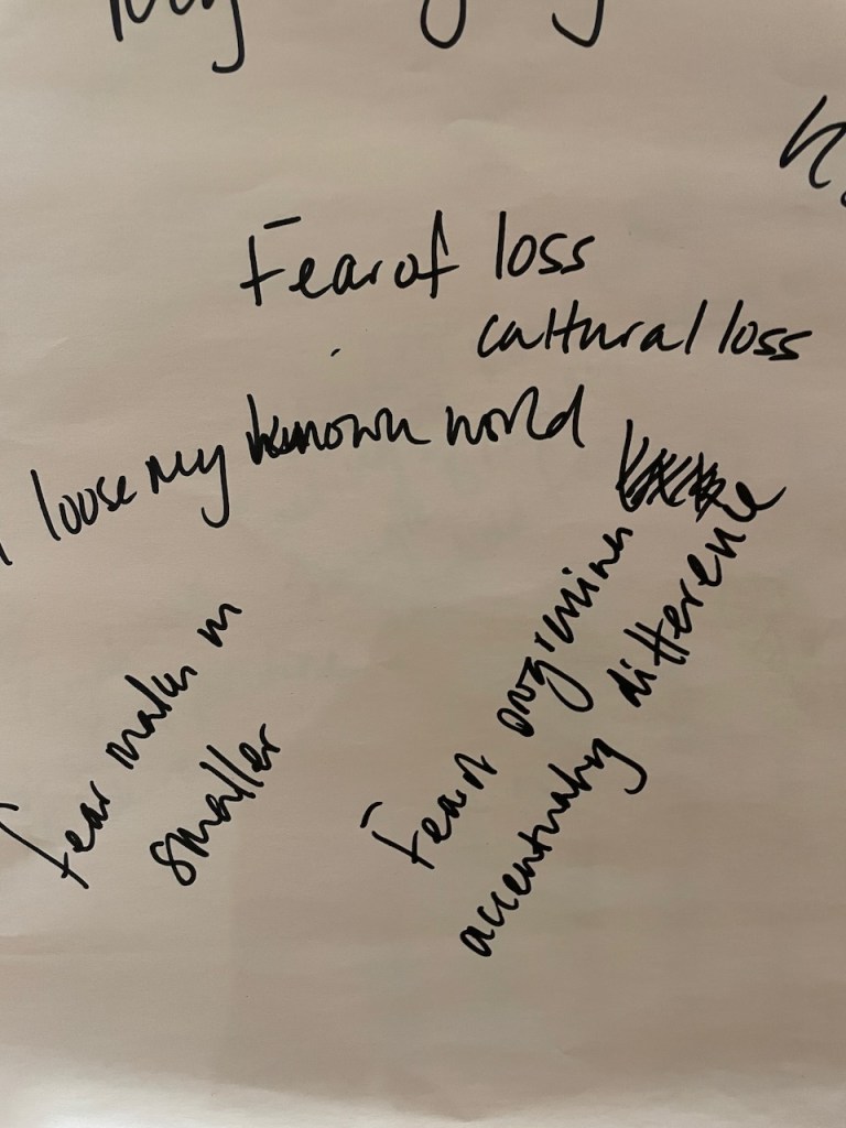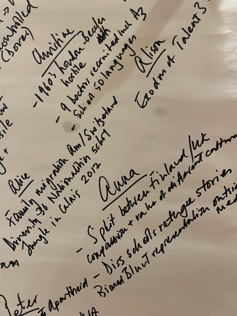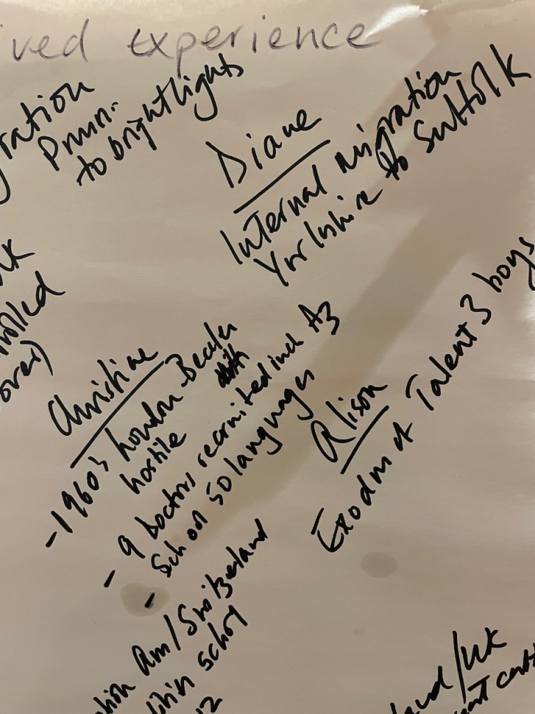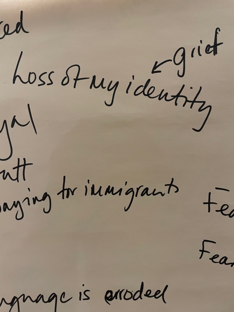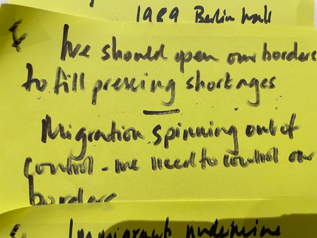 The 3 hours we had used an element of the Socratic Dialogue form, by inviting us to share our own direct experience of migration / immigration. This took a good hour with 16 fascinating and rich stories, in which sometimes surprisingly we found we all had some direct often family related experience of migration which we could relate to.