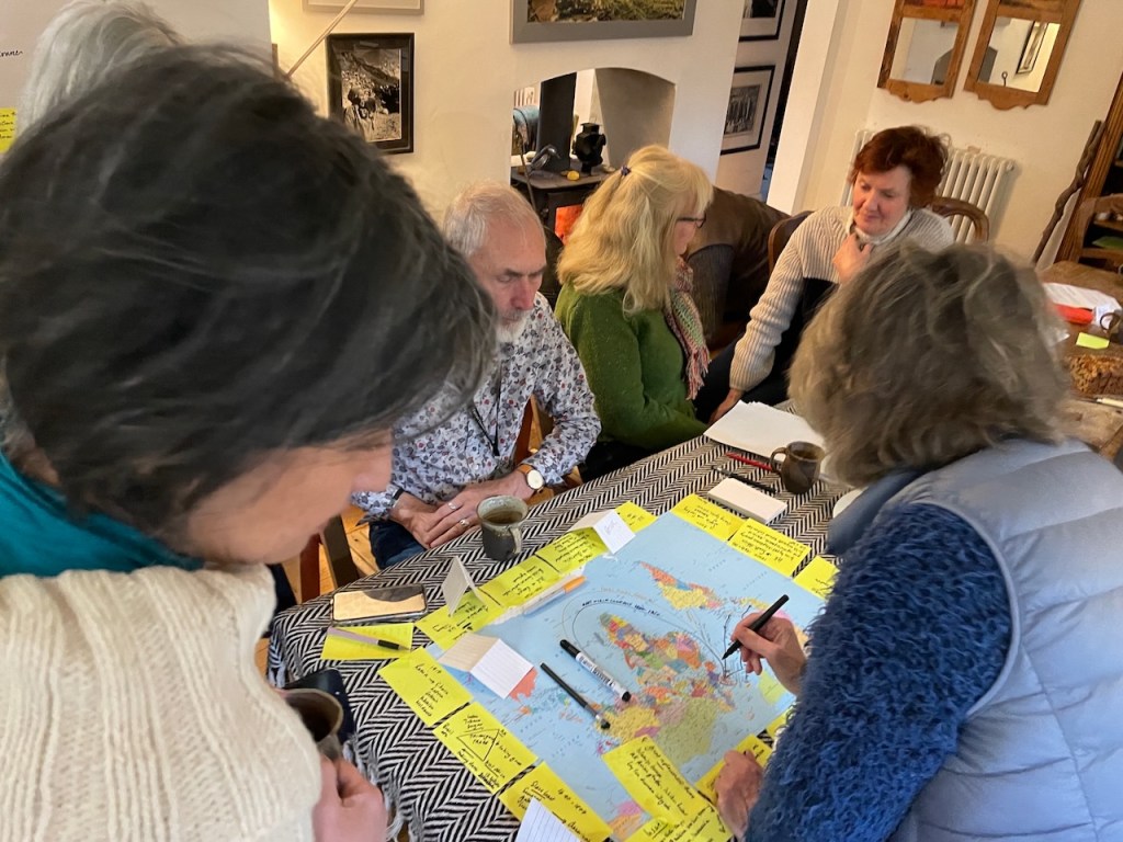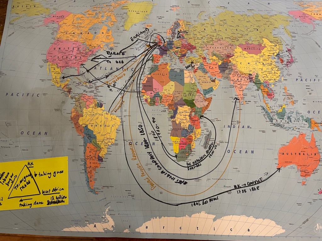 With our hive mind we recalled some historic migration, by adding routes coming and going mainly from the UK to a map the various migration routes we could recall. This illustrated that migration was part and parcel of human activity on this planet.