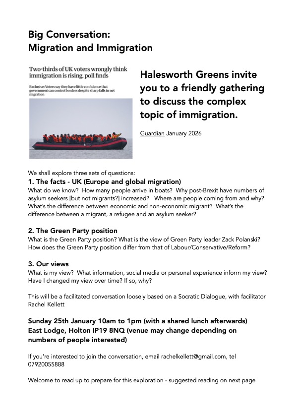 Halesworth Greens were invited to a friendly gathering to discuss the complex topic of immigration. The proposal was to explore 3 questions: The facts, the Green view, Our view. It was full and colourful and it didn’t go exactly to plan. On a dull January Sunday morning 16 people sat around a kitchen table in Holton.
