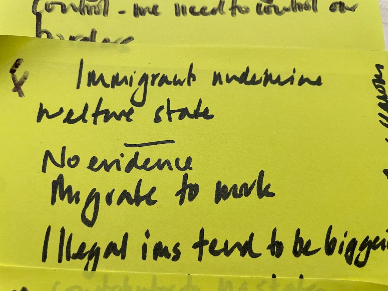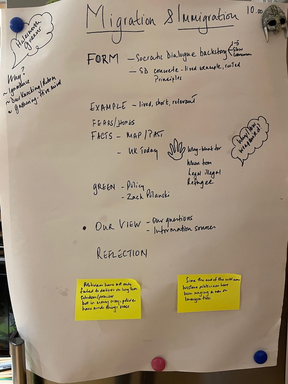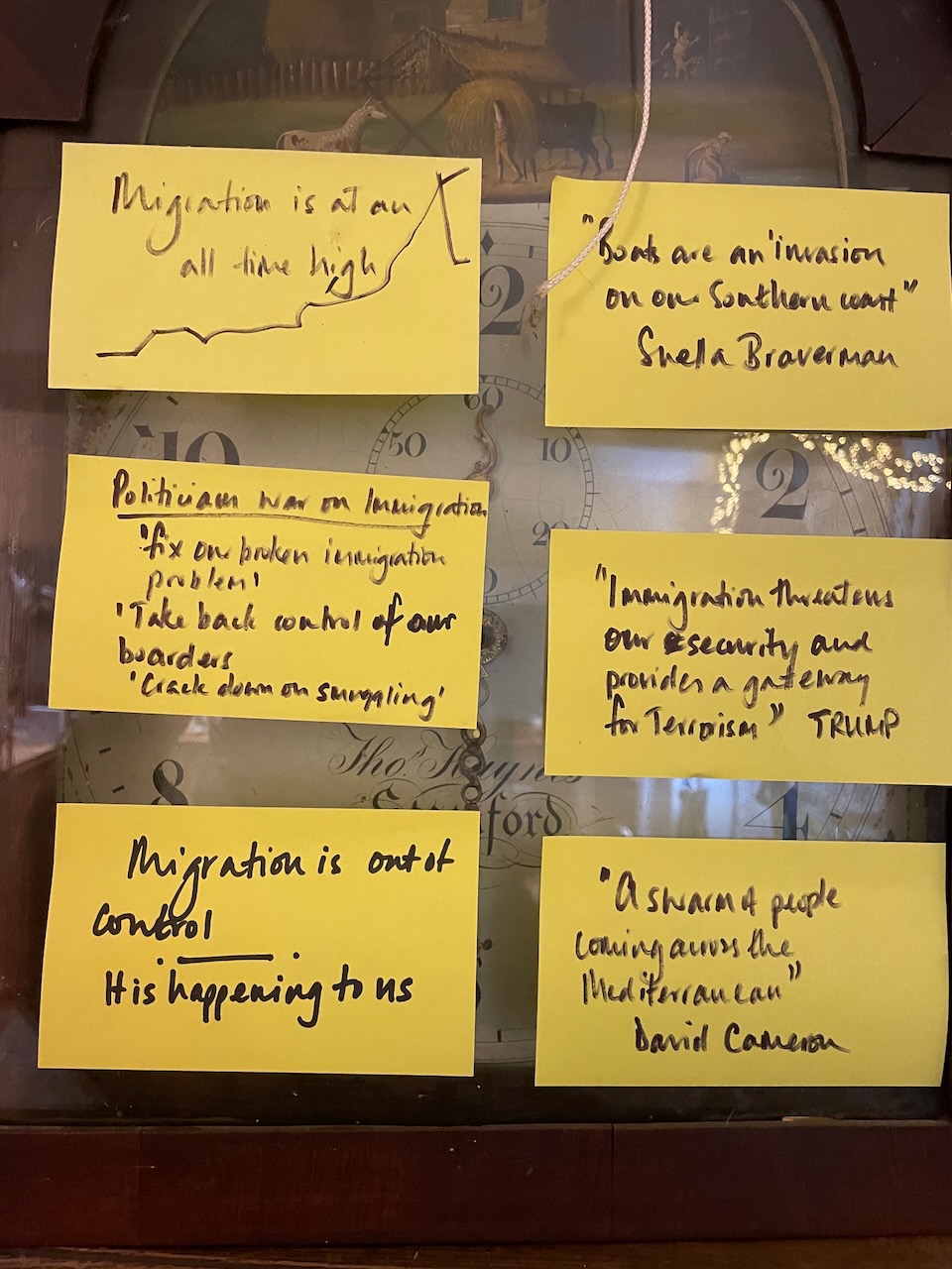 The 3 hours we had used an element of the Socratic Dialogue form, by inviting us to share our own direct experience of migration / immigration. This took a good hour with 16 fascinating and rich stories, in which sometimes surprisingly we found we all had some direct often family related experience of migration which we could relate to.