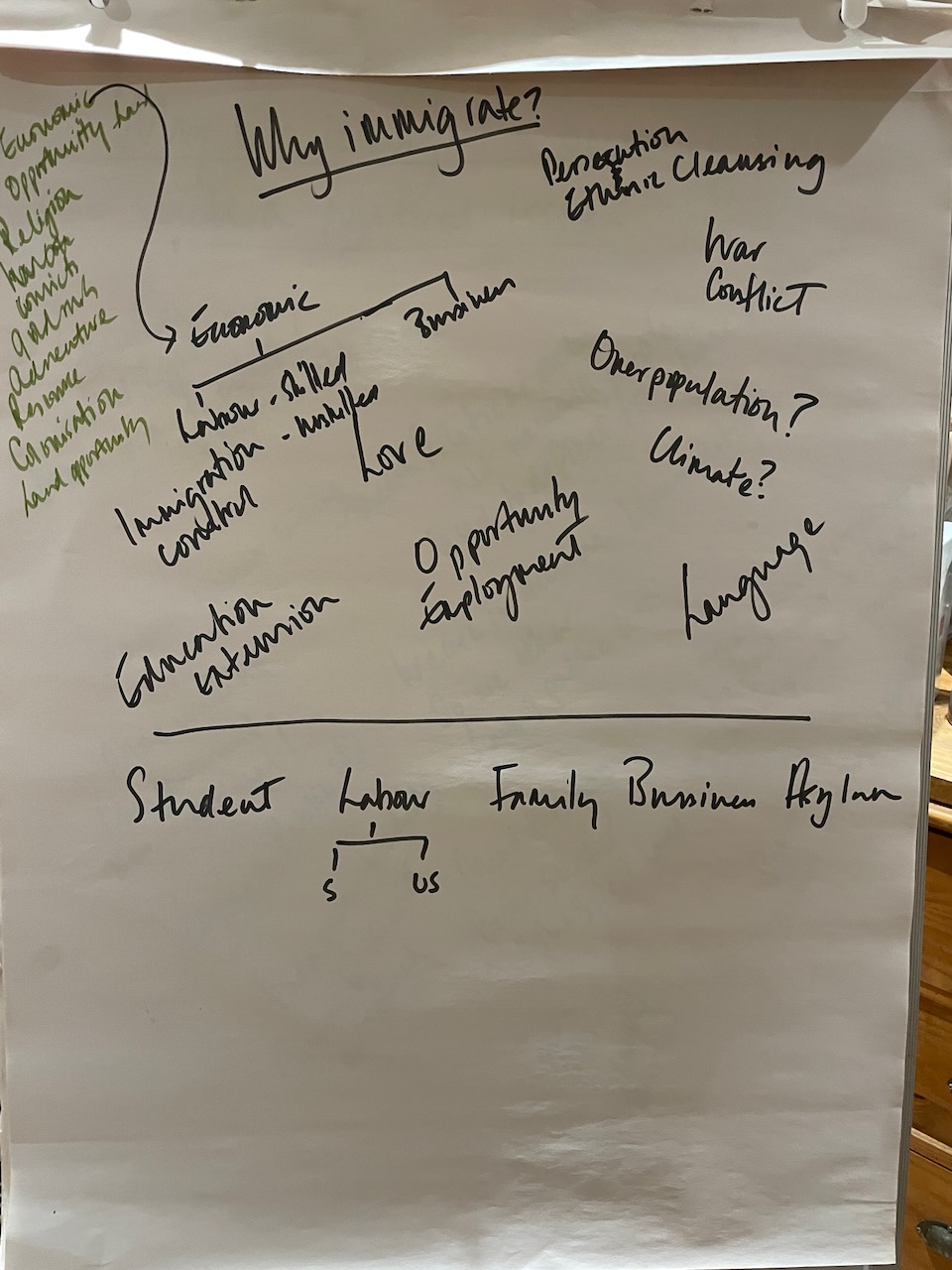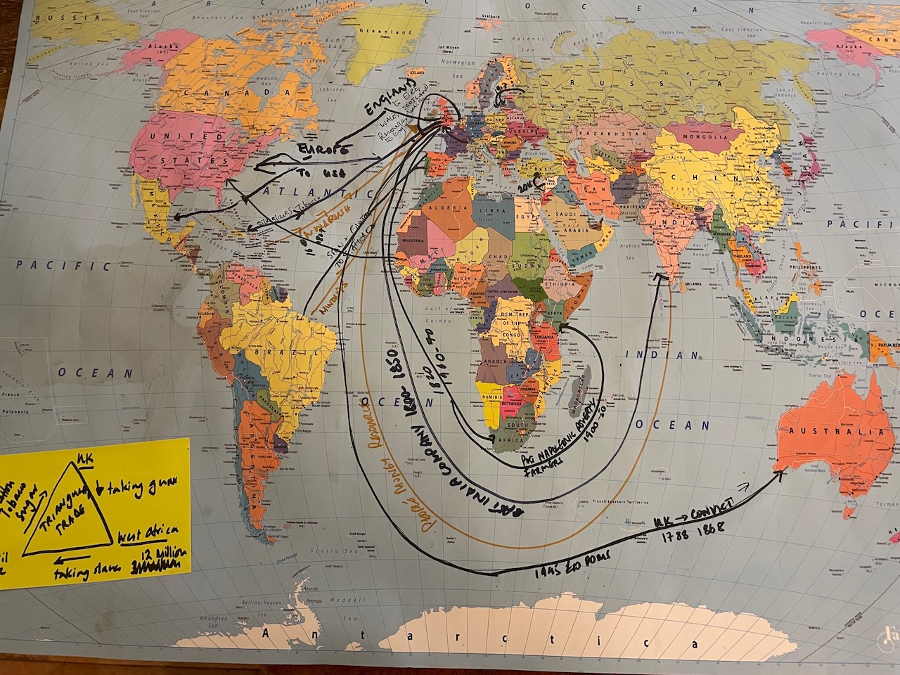 With our hive mind we recalled some historic migration, by adding routes coming and going mainly from the UK to a map the various migration routes we could recall. This illustrated that migration was part and parcel of human activity on this planet.