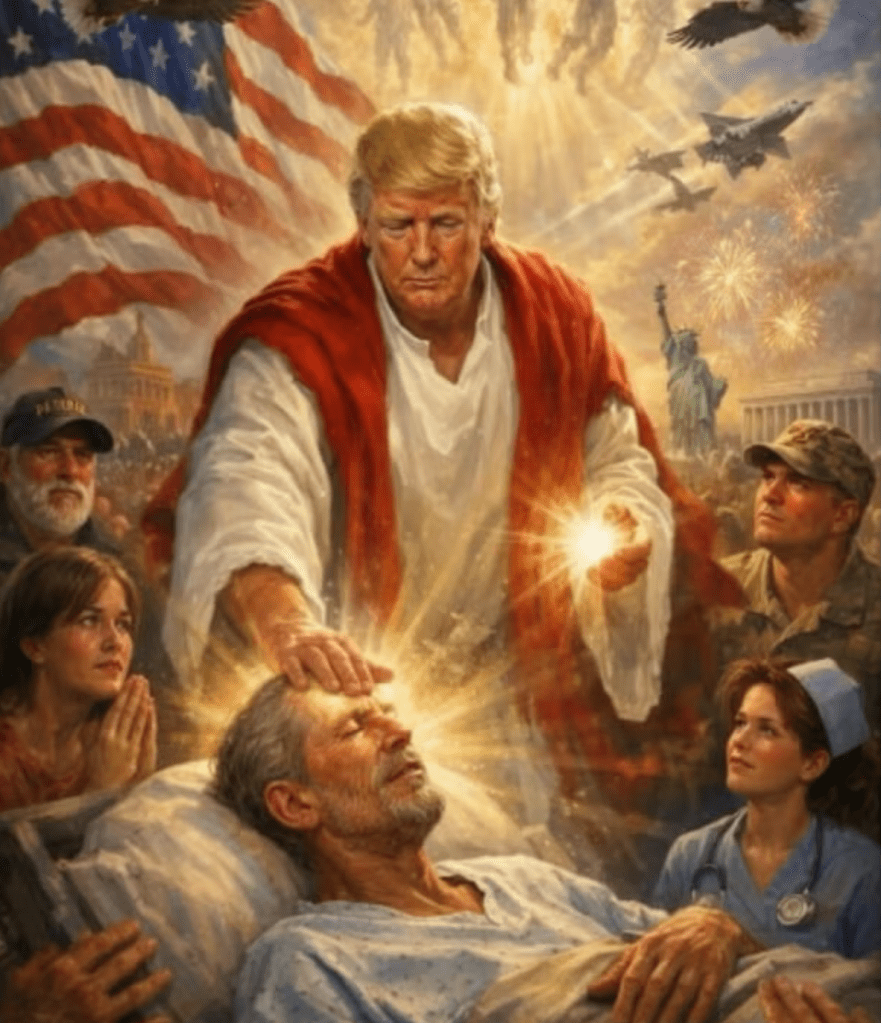Back in the zone, an image appears on Trumps social media late one night. The image showed President Trump bathed in divine light and clad in religious robes. A day later he explained. His interpretation was that the image depicted him as a doctor, not Jesus Christ. Doctors in the US start dressing up in middle eastern robes.